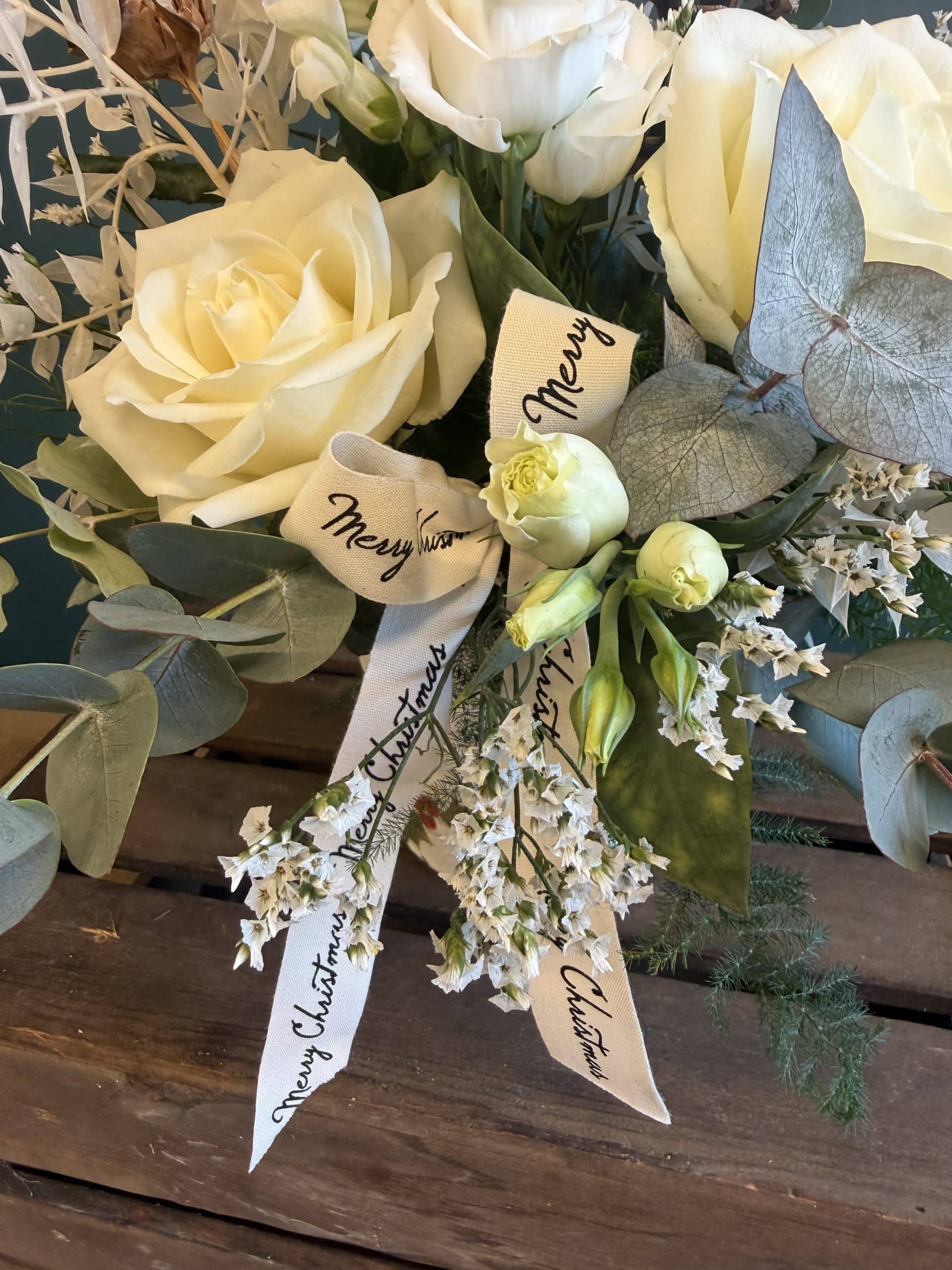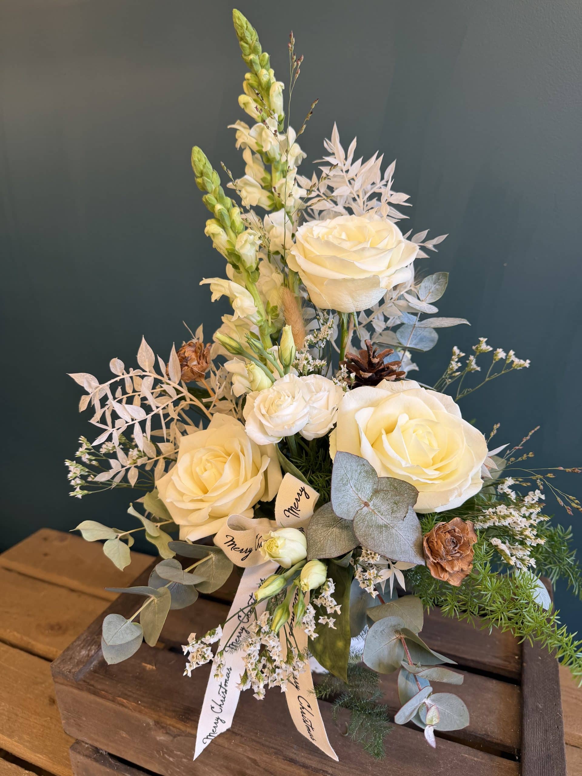 This design is back for 2025 a slightly new design and arranged in 1 of our new Christmas stone pots, it was a very popular choice in 2023, flowers inc Ivory Roses, bunny tails, Snap dragons & our new Merry Christmas ribbon.